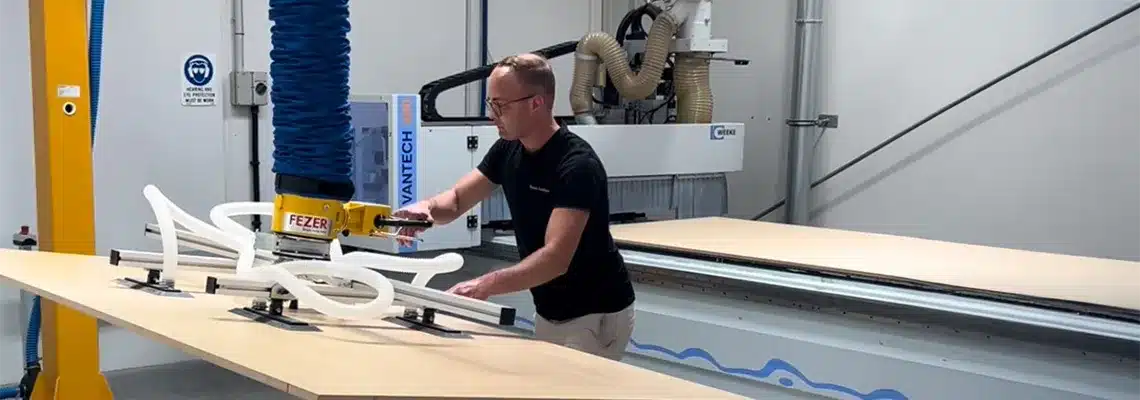 With growing demand driving a factory expansion, Acorn relocated several production machines and introduced a new CNC machine for cutting melamine sheets. To streamline workflow and improve operator safety, a reliable lifting solution was required to handle full melamine sheets and place them onto the CNC machine bed efficiently.